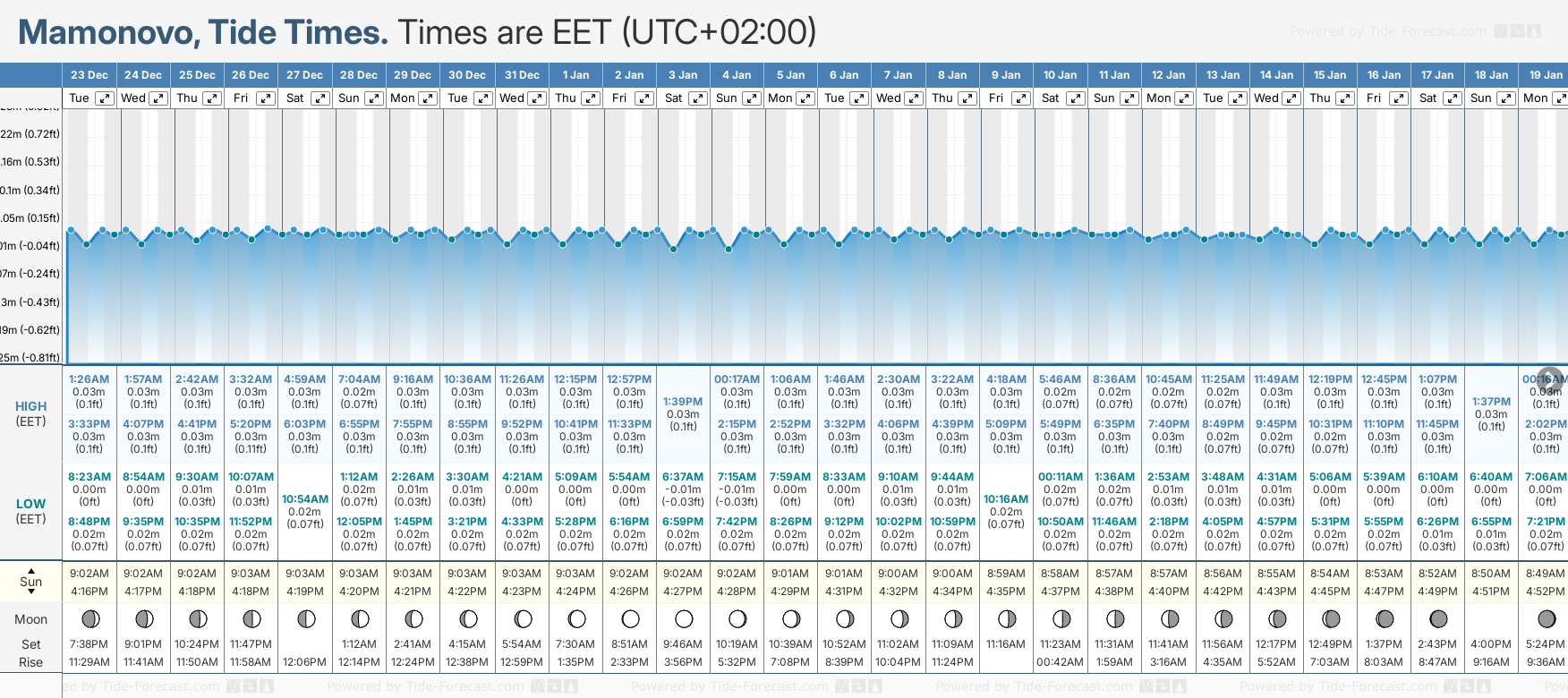 December and January Tide charts for Mamonovo: The tide charts below show the height, time and date of high and low tides for the next 30 days.