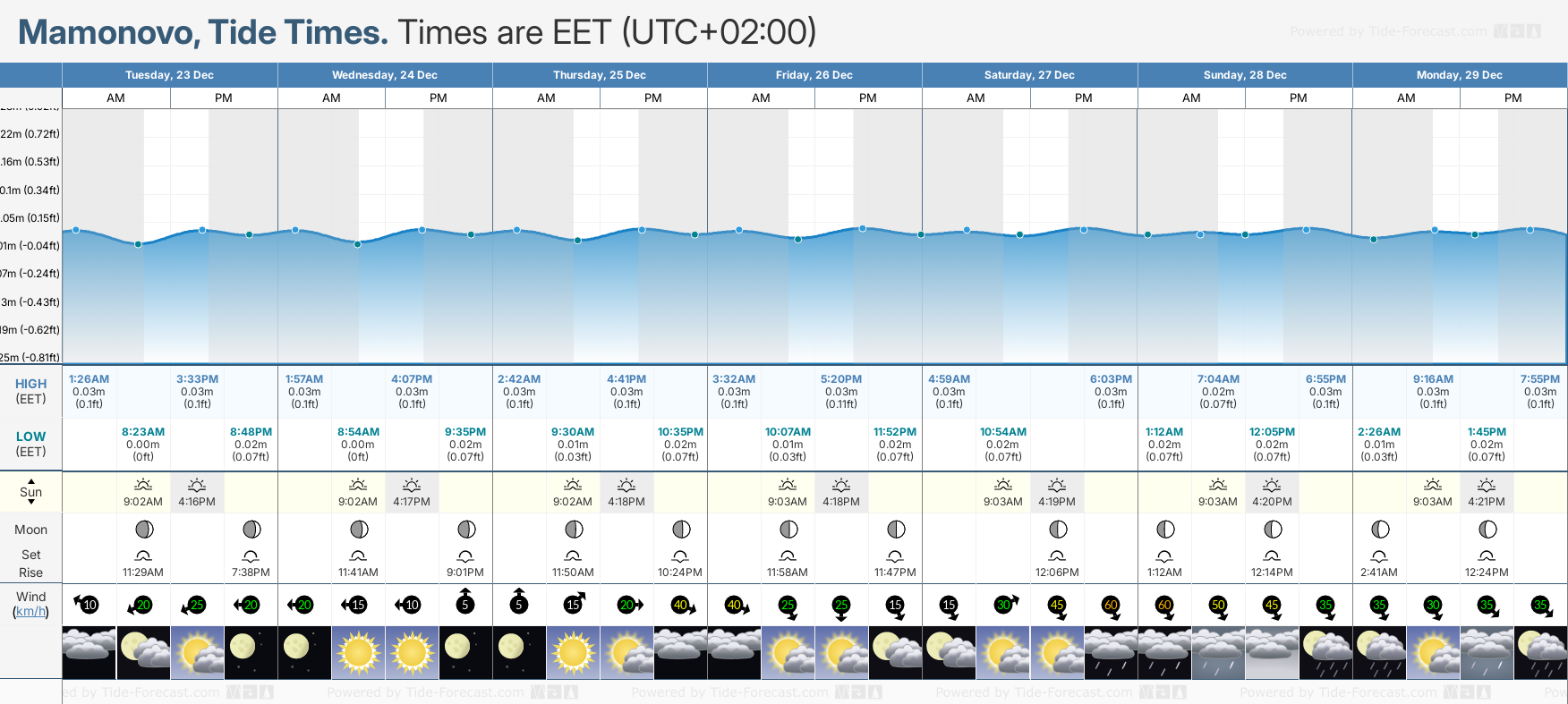 Tide Times are EET (UTC +2.0hrs). Last Spring High Tide at Mamonovo was on Tue 23 Dec (height: 0.03m 0.1ft). Next high Spring Tide at Mamonovo will be on Sun 28 Dec (height: 0.03m 0.1ft).