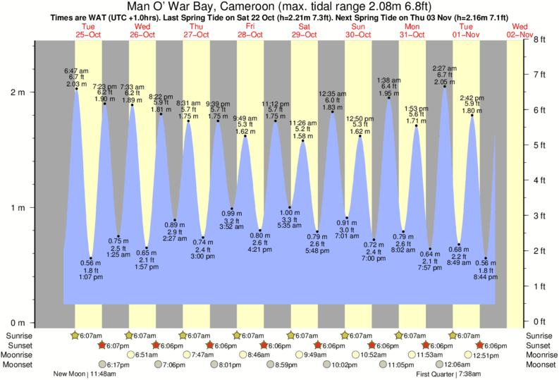 Man O' War Bay tide chart key: The tide chart above shows the height and times of high tide and low tide for Man O' War Bay, Cameroon. The grey shading corresponds to nighttime hours between sunset and sunrise at Man O' War Bay.