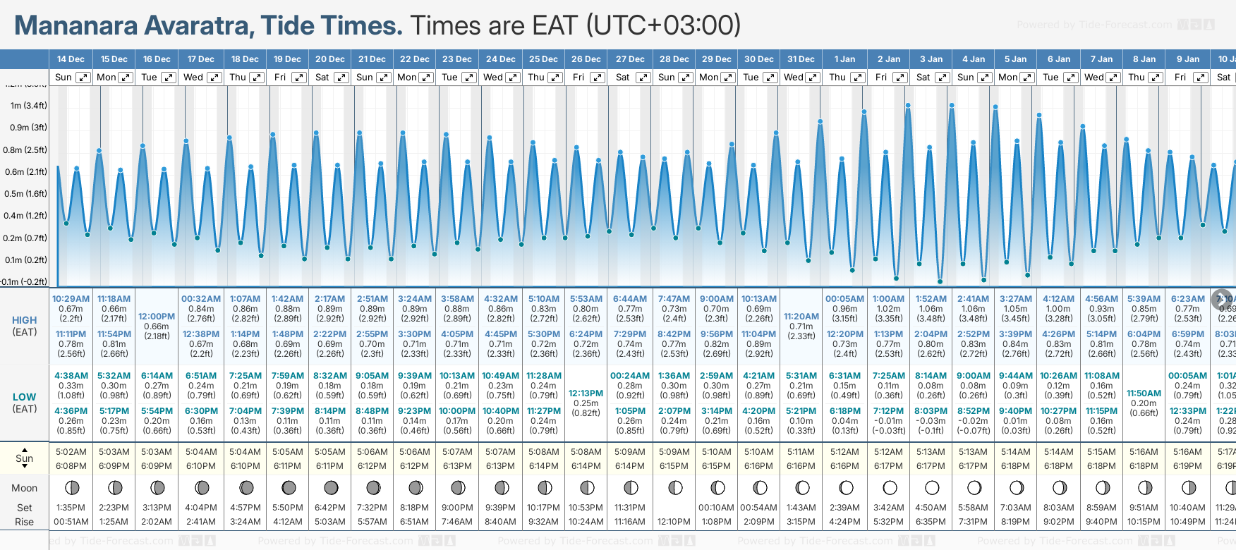 December and January Tide charts for Mananara Avaratra: The tide charts below show the height, time and date of high and low tides for the next 30 days.