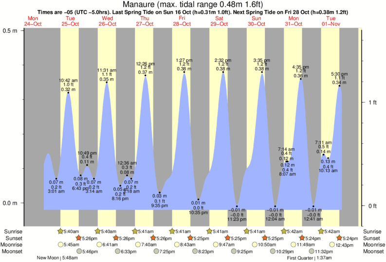 Tide Times are -05 (UTC -5.0hrs). Last Spring High Tide at Manaure was on Thu 18 Dec (height: 0.35m 1.1ft). Next high Spring Tide at Manaure will be on Thu 01 Jan (height: 0.44m 1.4ft).