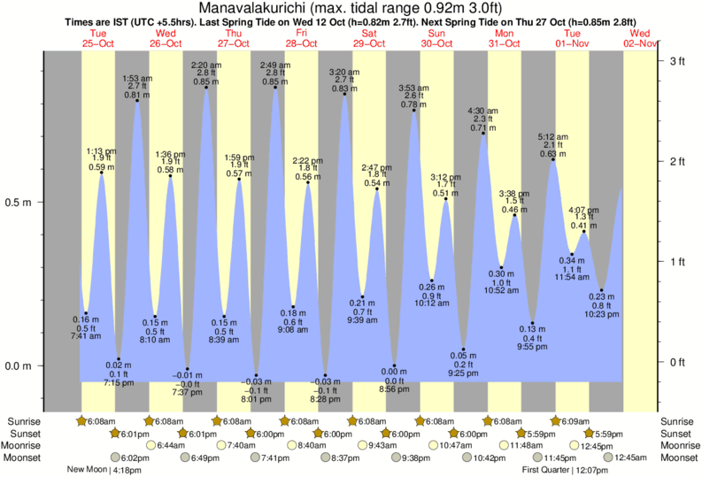 Tide Times are IST (UTC +5.5hrs). Last Spring High Tide at Manavalakurichi was on Sat 06 Dec (height: 0.85m 2.8ft). Next high Spring Tide at Manavalakurichi will be on Mon 22 Dec (height: 0.77m 2.5ft).