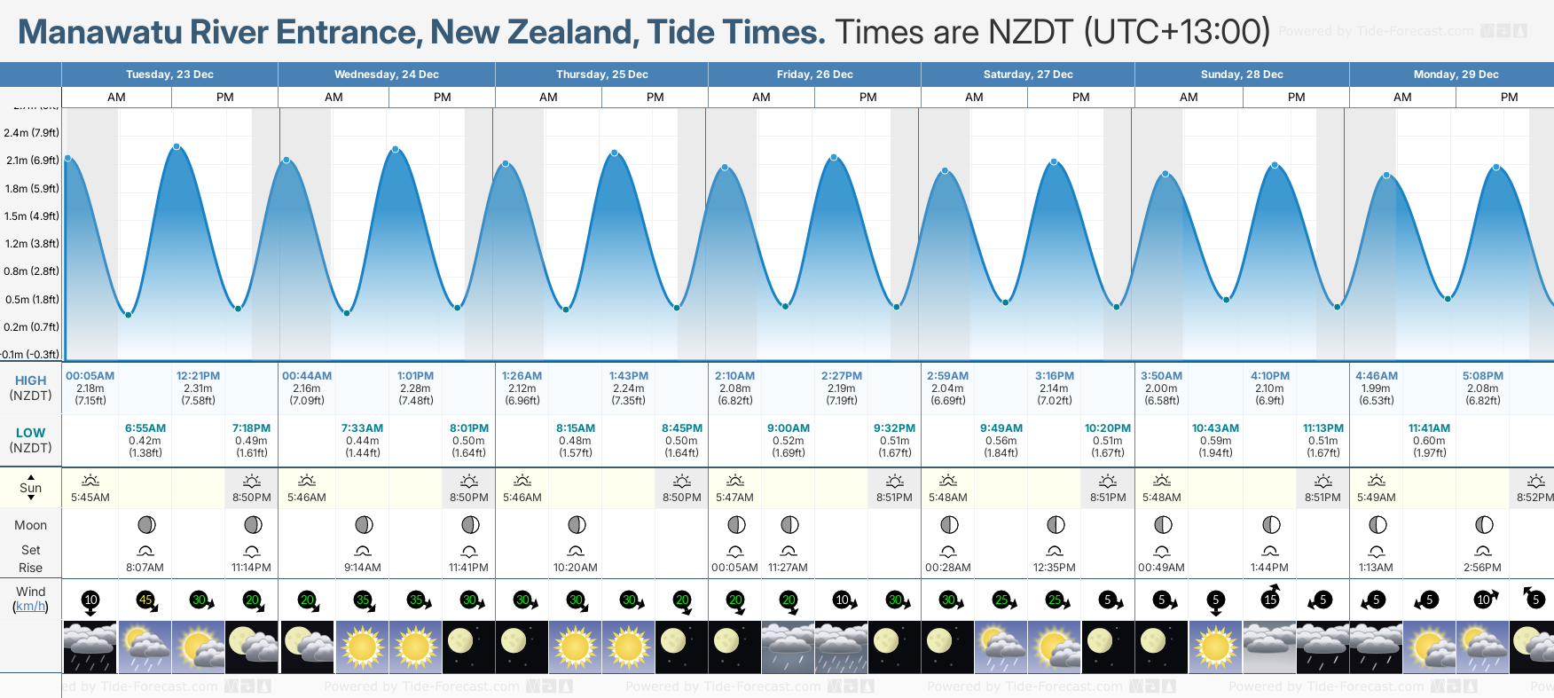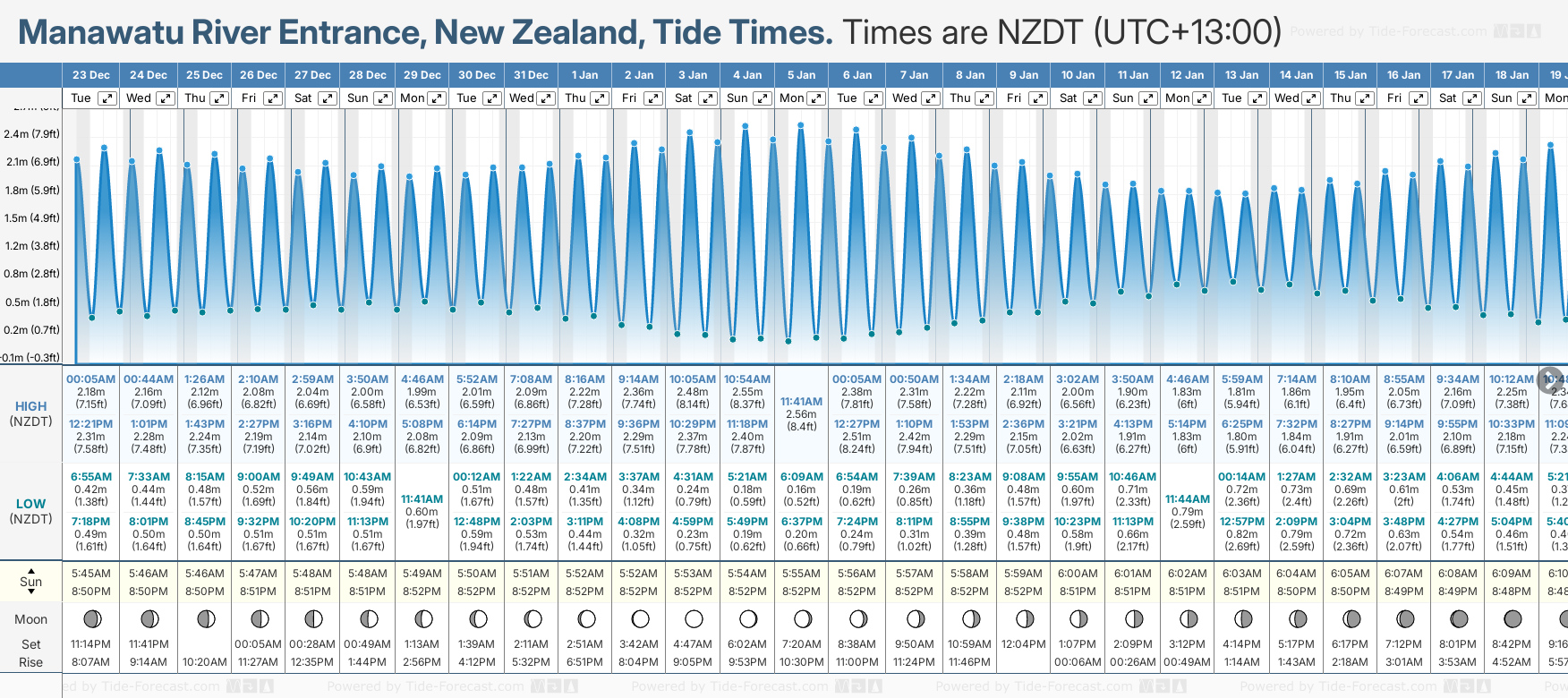 December and January Tide charts for Manawatu River Entrance: The tide charts below show the height, time and date of high and low tides for the next 30 days.