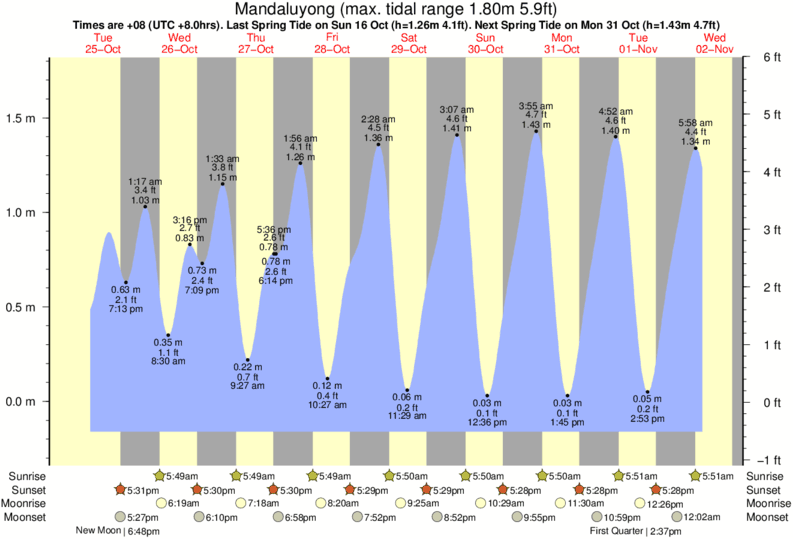 Tide Times are PST (UTC +8.0hrs). Last Spring High Tide at Mandaluyong was on Mon 08 Dec (height: 1.63m 5.3ft). Next high Spring Tide at Mandaluyong will be on Mon 22 Dec (height: 1.44m 4.7ft).