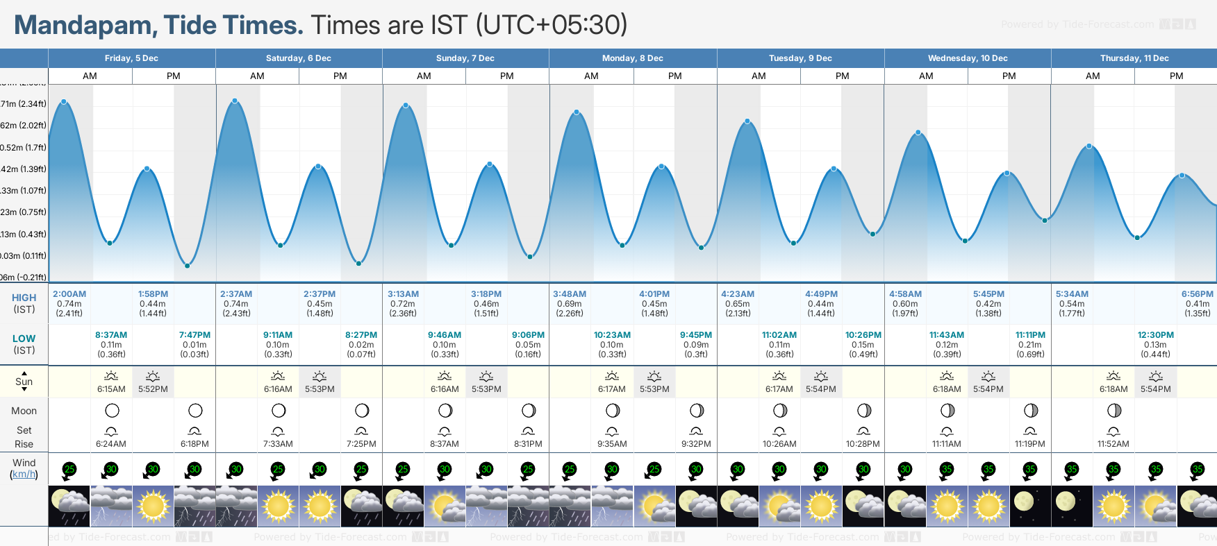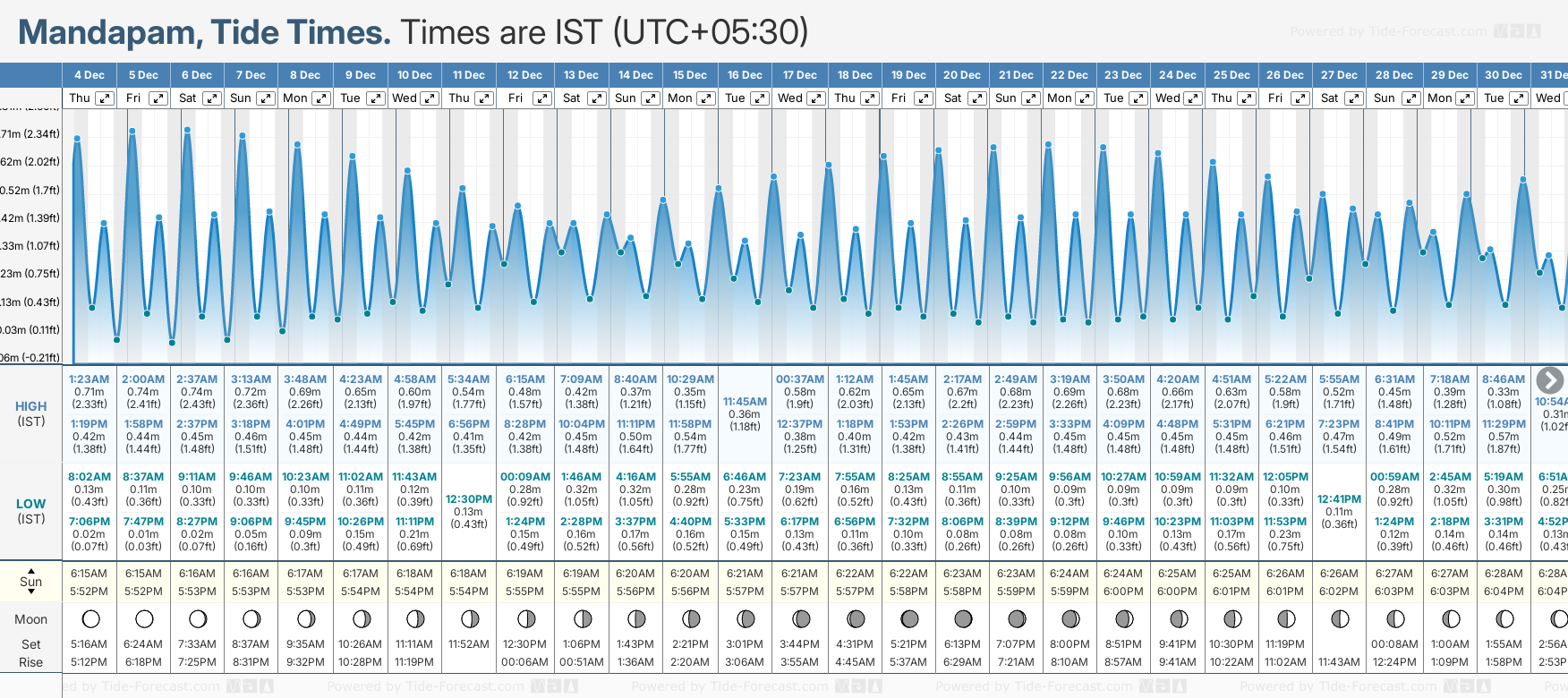 December Tide charts for Mandapam: The tide charts below show the height, time and date of high and low tides for the next 30 days.
