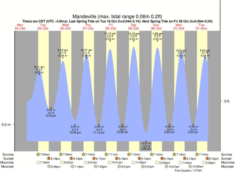 Tide chart for MandevilleShowing low and high tide times for the next 30 days at Mandeville. Tide Times are CST (UTC -6.0hrs).