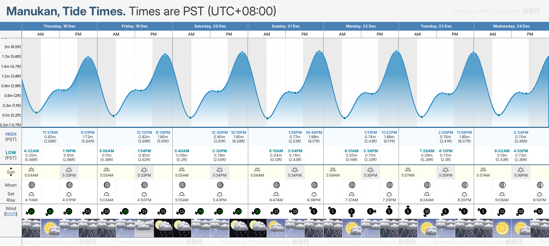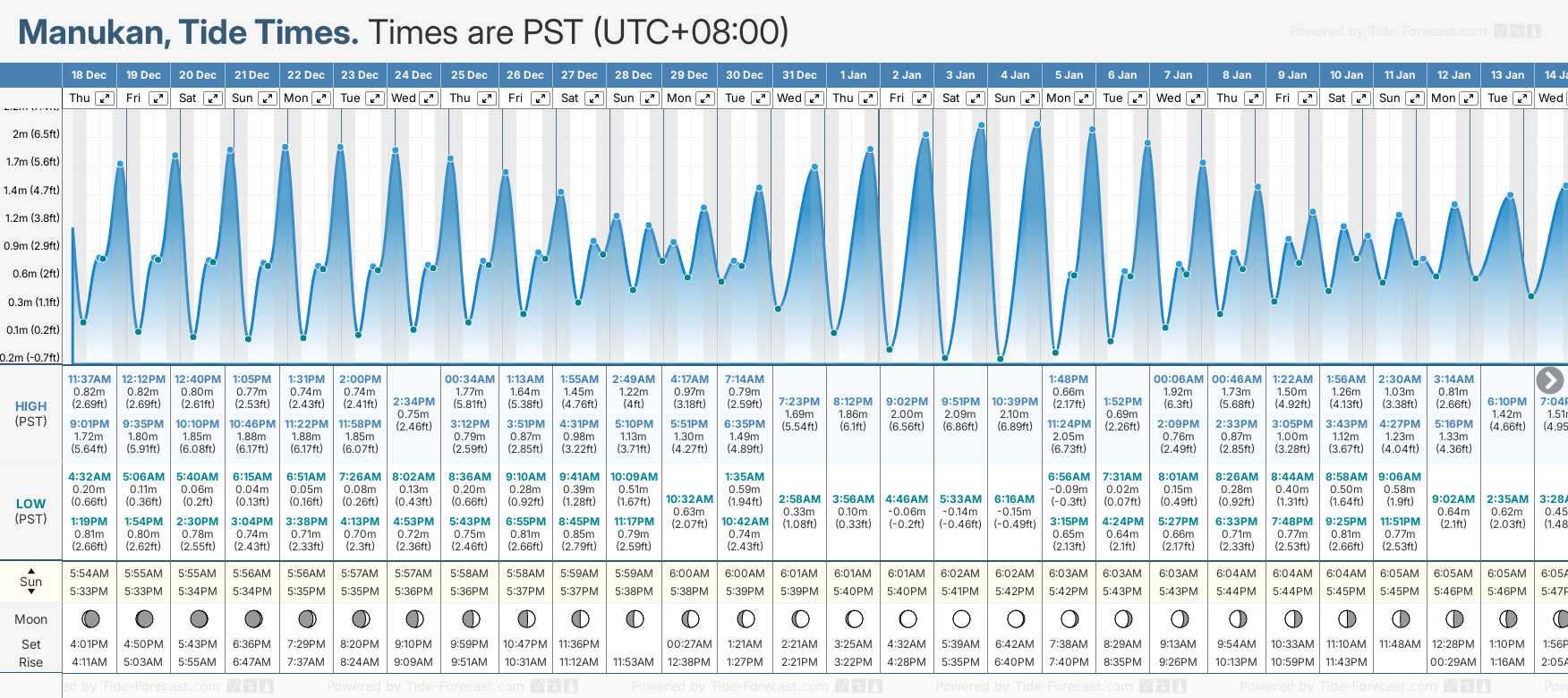 December and January Tide charts for Manukan: The tide charts below show the height, time and date of high and low tides for the next 30 days.