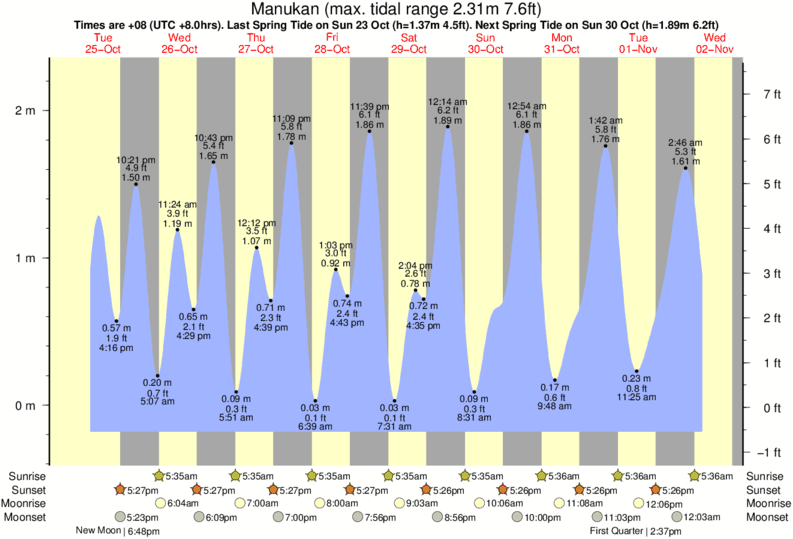 Tide Times are PST (UTC +8.0hrs). Last Spring High Tide at Manukan was on Sun 07 Dec (height: 2.13m 7.0ft). Next high Spring Tide at Manukan will be on Mon 22 Dec (height: 1.88m 6.2ft).