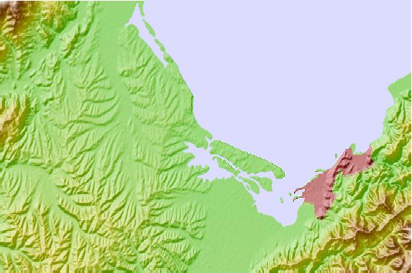 Use this relief map to navigate to tide stations, surf breaks and cities that are in the area of Mapua, New Zealand.
