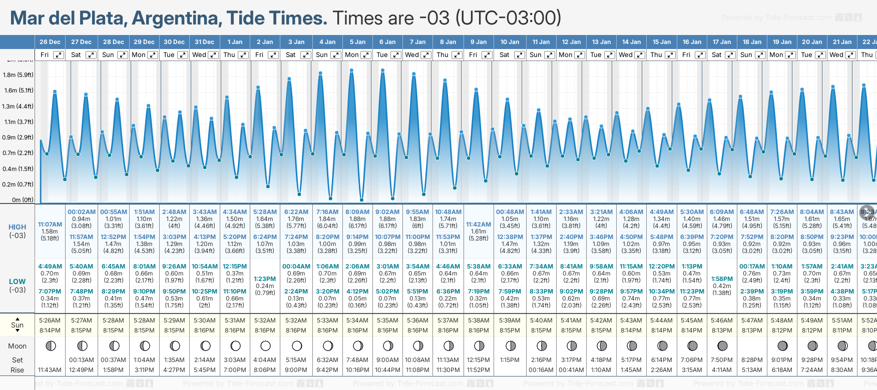 December and January Tide charts for Mar del Plata: The tide charts below show the height, time and date of high and low tides for the next 30 days.