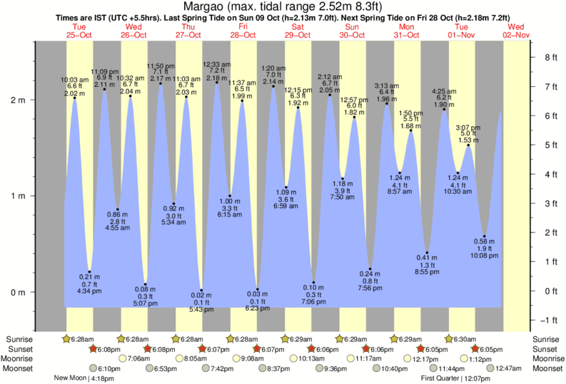 Tide Times are IST (UTC +5.5hrs). Last Spring High Tide at Margao was on Sat 06 Dec (height: 2.31m 7.6ft). Next high Spring Tide at Margao will be on Tue 23 Dec (height: 2.09m 6.9ft).