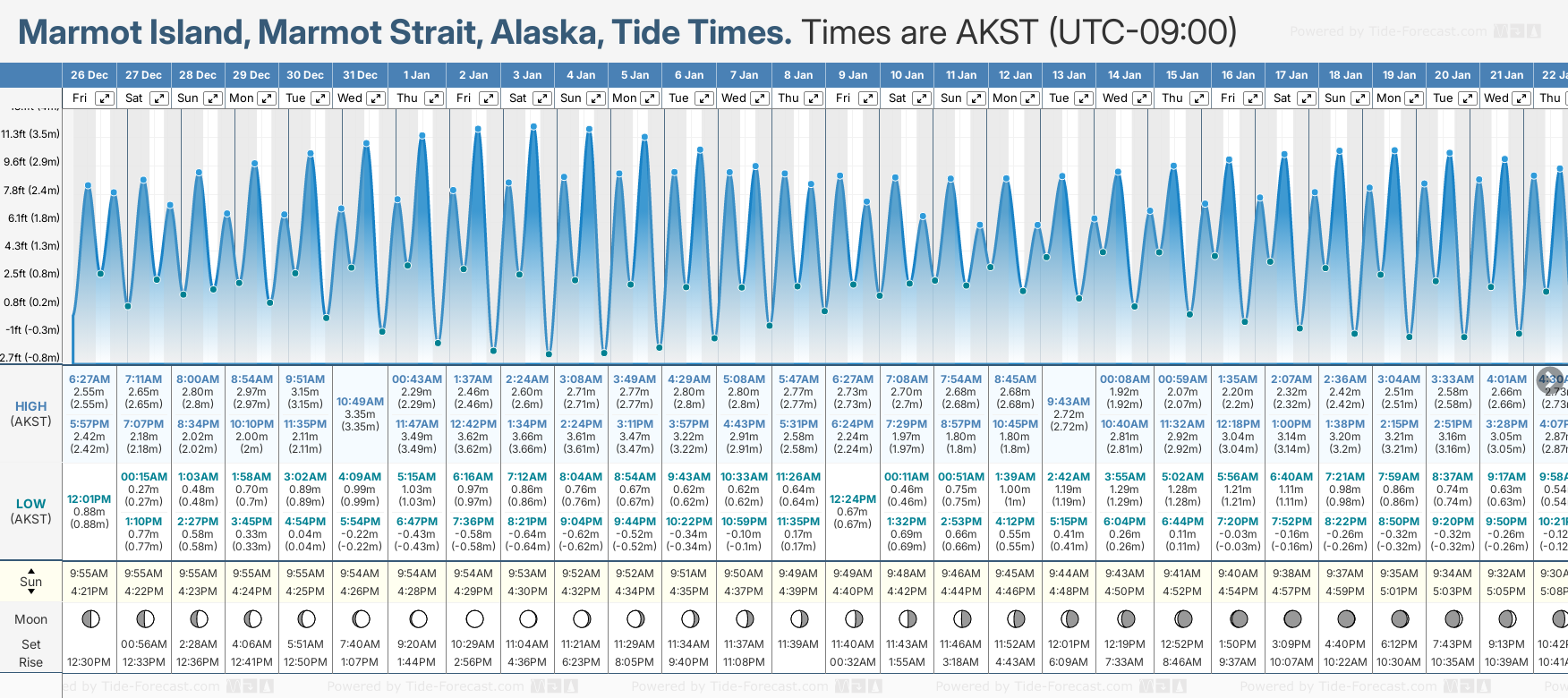 December and January Tide charts for Marmot Island, Marmot Strait: The tide charts below show the height, time and date of high and low tides for the next 30 days.