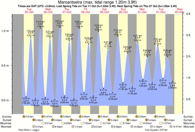 Tide Times are EAT (UTC +3.0hrs). Last Spring High Tide at Maroantsetra was on Sat 20 Dec (height: 0.91m 3.0ft). Next high Spring Tide at Maroantsetra will be on Sun 04 Jan (height: 1.09m 3.6ft).