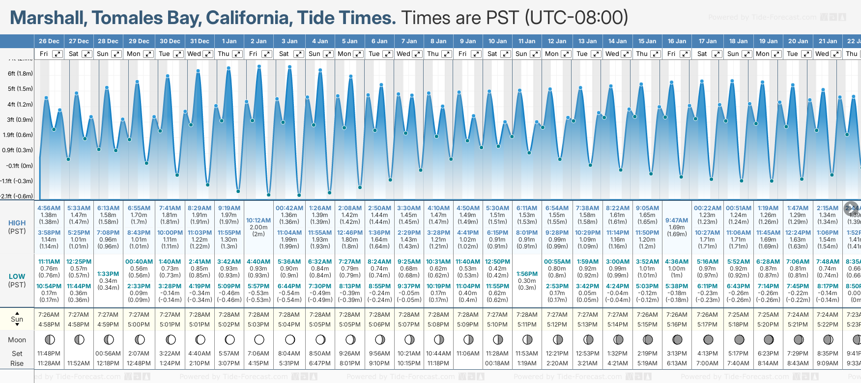 December and January Tide charts for Marshall, Tomales Bay: The tide charts below show the height, time and date of high and low tides for the next 30 days.