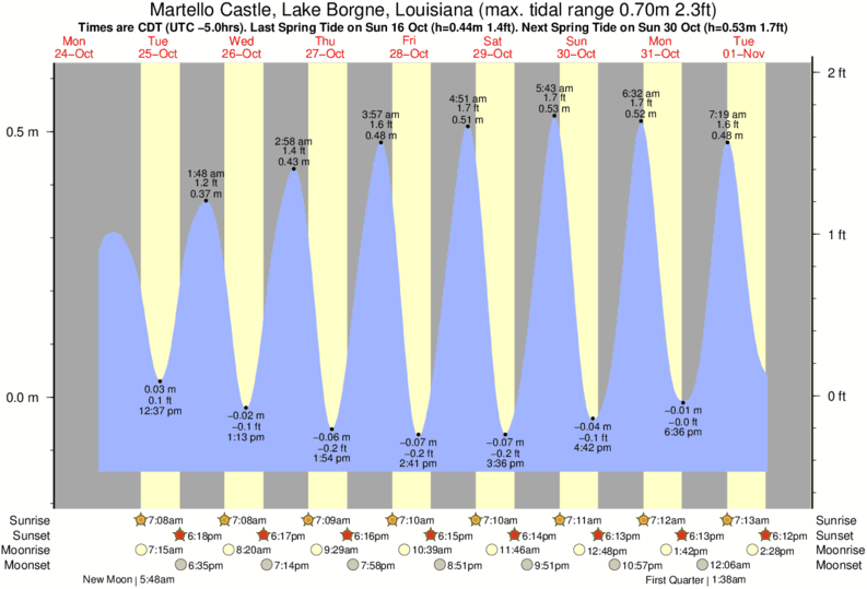 Martello Castle, Lake Borgne tide chart key: The tide chart above shows the height and times of high tide and low tide for Martello Castle, Lake Borgne, Louisiana. The grey shading corresponds to nighttime hours between sunset and sunrise at Martello Castle, Lake Borgne.