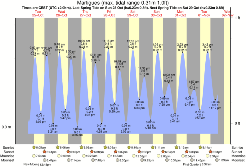 Tide Times are CET (UTC +1.0hrs). Last Spring High Tide at Martigues was on Mon 08 Dec (height: 0.27m 0.9ft). Next high Spring Tide at Martigues will be on Sun 21 Dec (height: 0.25m 0.8ft).