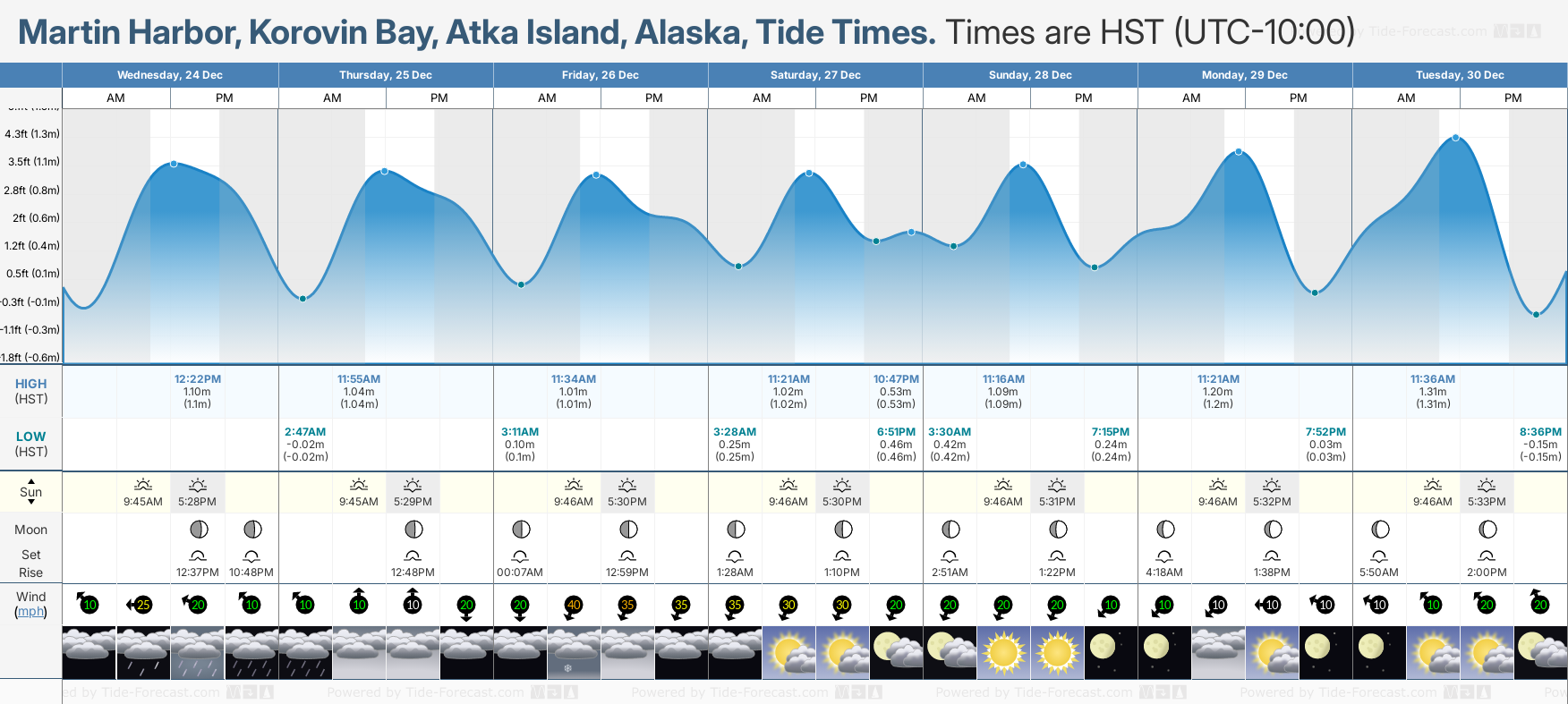 December and January Tide charts for Martin Harbor, Korovin Bay, Atka Island: The tide charts below show the height, time and date of high and low tides for the next 30 days.