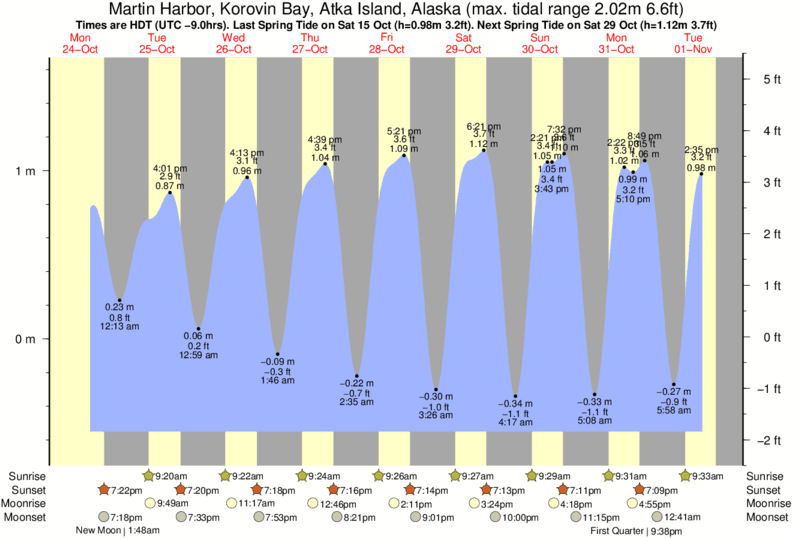 Tide Times are HST (UTC -10.0hrs). Last Spring High Tide at Martin Harbor, Korovin Bay, Atka Island was on Fri 05 Dec (height: 1.42m 4.7ft). Next high Spring Tide at Martin Harbor, Korovin Bay, Atka Island will be on Sat 20 Dec (height: 1.28m 4.2ft).