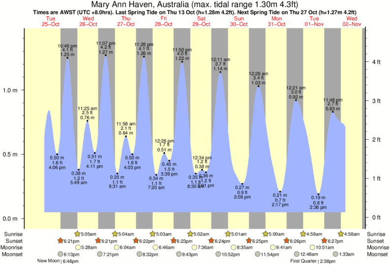 Tide Times are AWST (UTC +8.0hrs). Last Spring High Tide at Mary Ann Haven was on Fri 05 Dec (height: 1.21m 4.0ft). Next high Spring Tide at Mary Ann Haven will be on Mon 22 Dec (height: 1.14m 3.7ft).