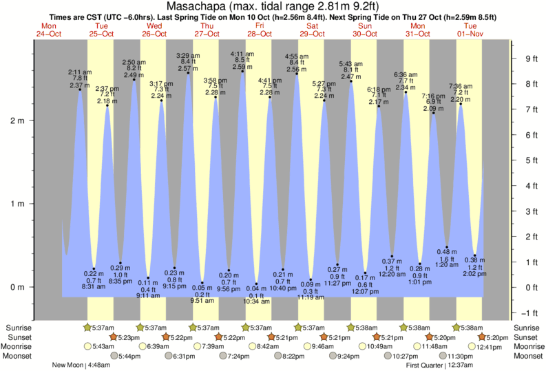 Tide Times are CST (UTC -6.0hrs). Last Spring High Tide at Masachapa was on Fri 05 Dec (height: 2.69m 8.8ft). Next high Spring Tide at Masachapa will be on Sat 20 Dec (height: 2.25m 7.4ft).