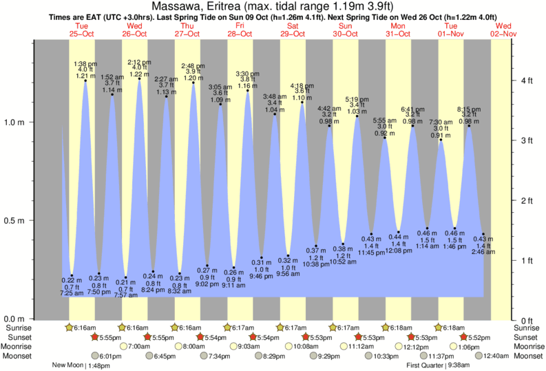 Tide Times are EAT (UTC +3.0hrs). Last Spring High Tide at Massawa was on Thu 18 Dec (height: 1.09m 3.6ft). Next high Spring Tide at Massawa will be on Sat 03 Jan (height: 1.26m 4.1ft).