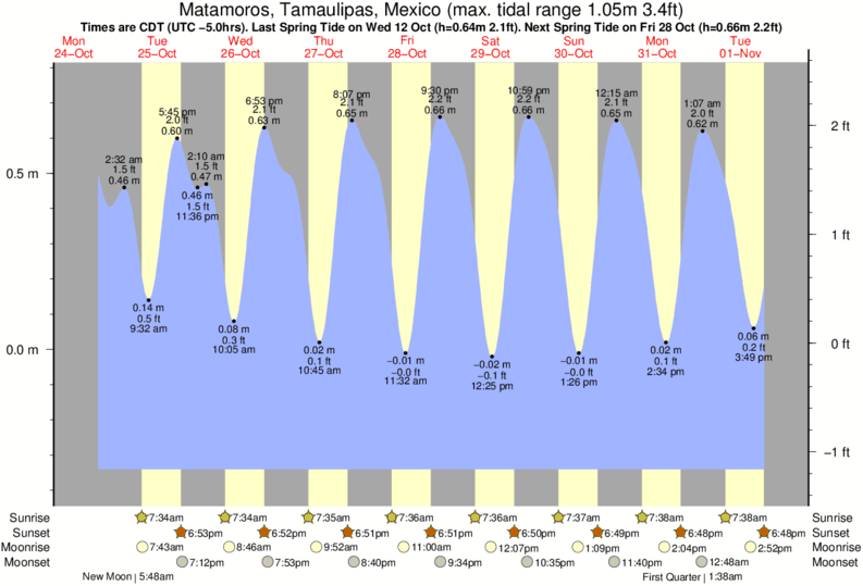 Tide Times are CST (UTC -6.0hrs). Last Spring High Tide at Matamoros was on Wed 17 Dec (height: 0.42m 1.4ft). Next high Spring Tide at Matamoros will be on Thu 01 Jan (height: 0.49m 1.6ft).