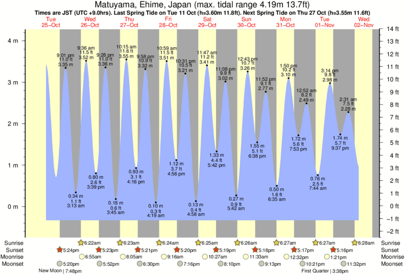 Tide Times are JST (UTC +9.0hrs). Last Spring High Tide at Matuyama was on Sat 06 Dec (height: 3.61m 11.8ft). Next high Spring Tide at Matuyama will be on Mon 22 Dec (height: 3.25m 10.7ft).