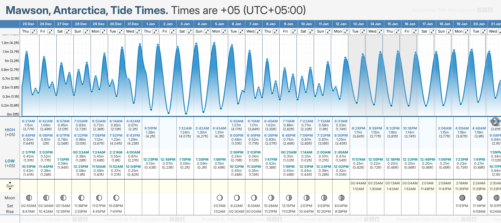 Tide chart for MawsonShowing low and high tide times for the next 30 days at Mawson. Tide Times are +05 (UTC +5.0hrs).