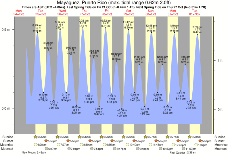 Tide Times are AST (UTC -4.0hrs). Last Spring High Tide at Mayaguez was on Fri 19 Dec (height: 0.41m 1.3ft). Next high Spring Tide at Mayaguez will be on Wed 24 Dec (height: 0.43m 1.4ft).