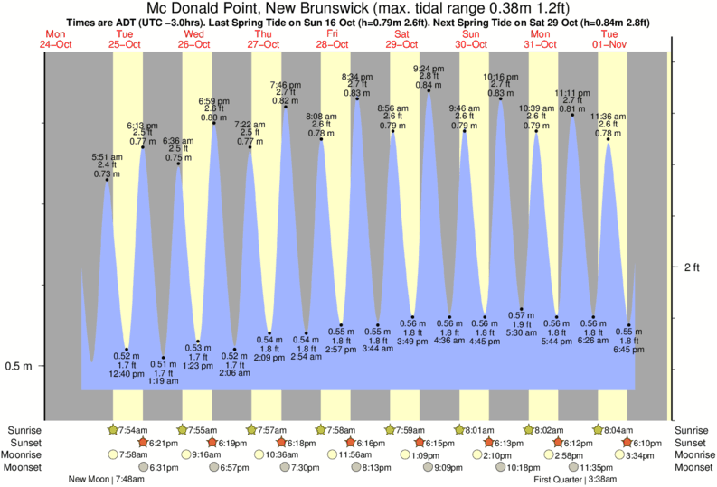 Mc Donald Point tide chart key: The tide chart above shows the height and times of high tide and low tide for Mc Donald Point, New Brunswick. The grey shading corresponds to nighttime hours between sunset and sunrise at Mc Donald Point.