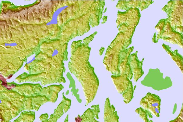 Use this relief map to navigate to tide stations, surf breaks and cities that are in the area of McMicken Island, Case Inlet, Puget Sound, Washington.