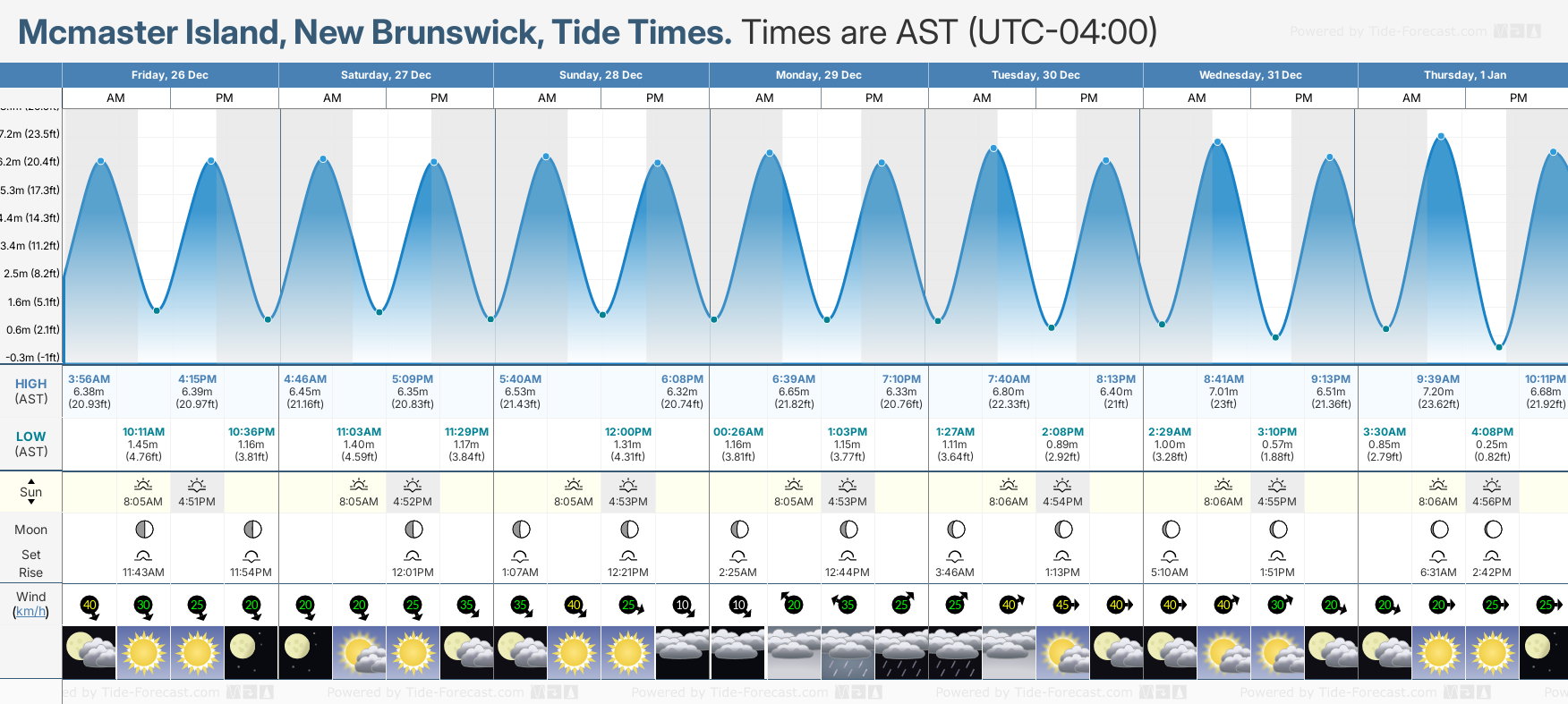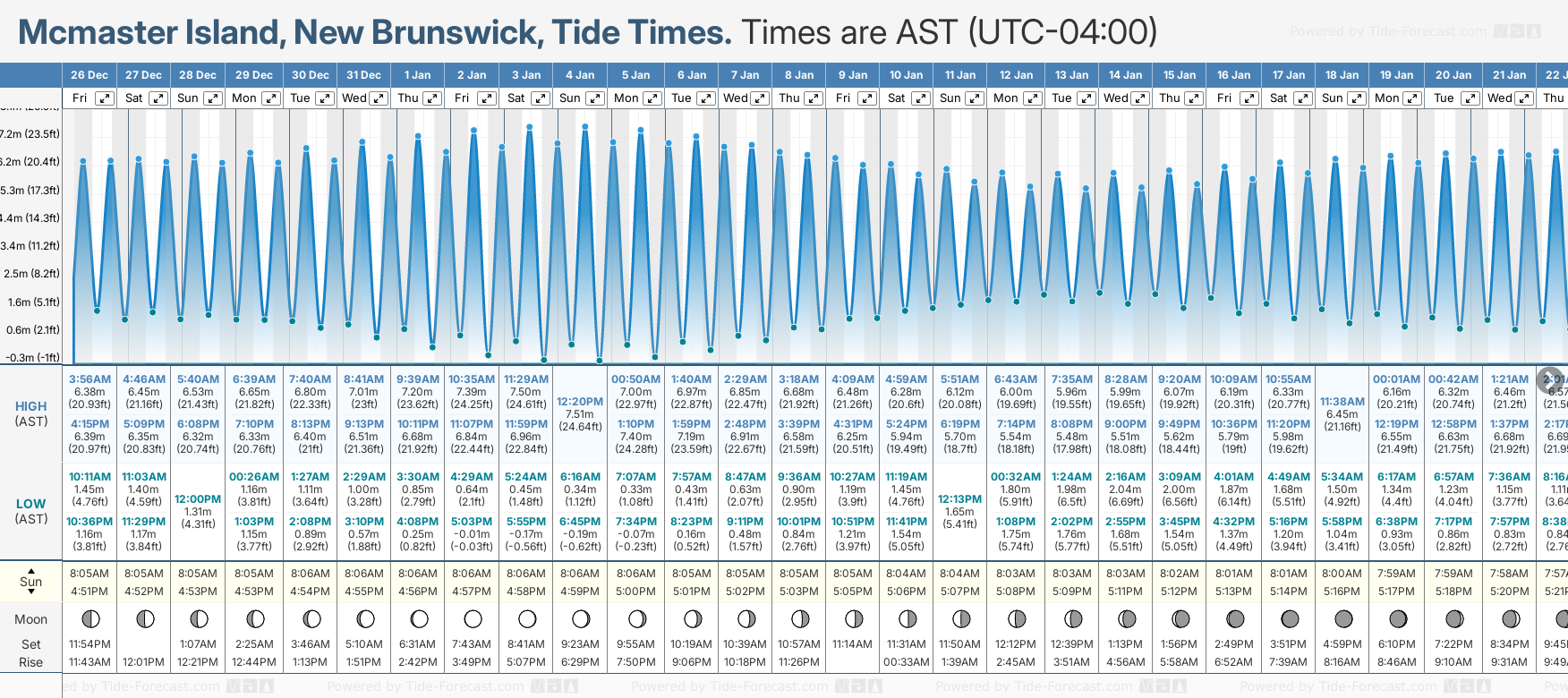 Tide Times are AST (UTC -4.0hrs). Last Spring High Tide at Mcmaster Island was on Mon 22 Dec (height: 6.45m 21.2ft). Next high Spring Tide at Mcmaster Island will be on Sun 04 Jan (height: 7.51m 24.6ft).