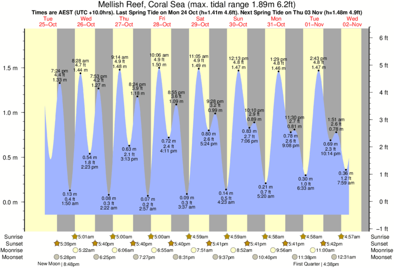 Tide Times are AEST (UTC +10.0hrs). Last Spring High Tide at Mellish Reef was on Sat 06 Dec (height: 1.71m 5.6ft). Next high Spring Tide at Mellish Reef will be on Mon 22 Dec (height: 1.54m 5.1ft).