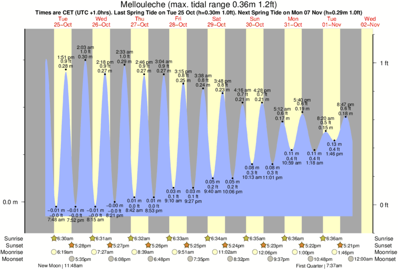 Tide chart for MelloulecheShowing low and high tide times for the next 30 days at Mellouleche. Tide Times are CET (UTC +1.0hrs).