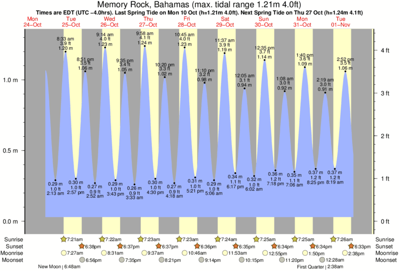 Memory Rock tide chart key: The tide chart above shows the height and times of high tide and low tide for Memory Rock, Bahamas. The grey shading corresponds to nighttime hours between sunset and sunrise at Memory Rock.
