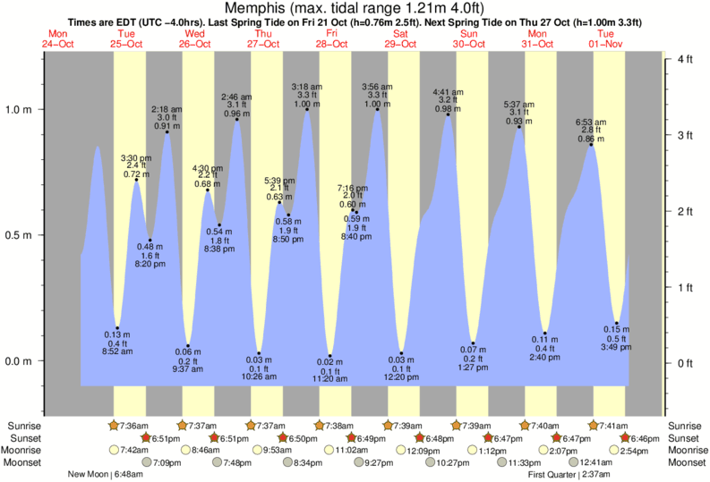 Tide Times are EST (UTC -5.0hrs). Last Spring High Tide at Memphis was on Fri 05 Dec (height: 1.11m 3.6ft). Next high Spring Tide at Memphis will be on Fri 02 Jan (height: 1.10m 3.6ft).