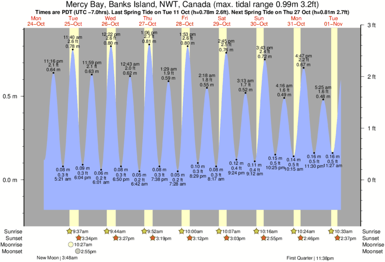 Tide Times are MST (UTC -7.0hrs). Last Spring High Tide at Mercy Bay, Banks Island, NWT was on Fri 05 Dec (height: 0.78m 2.6ft). Next high Spring Tide at Mercy Bay, Banks Island, NWT will be on Sat 20 Dec (height: 0.58m 1.9ft).