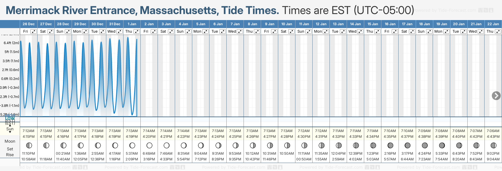 December and January Tide charts for Merrimack River Entrance: The tide charts below show the height, time and date of high and low tides for the next 30 days.