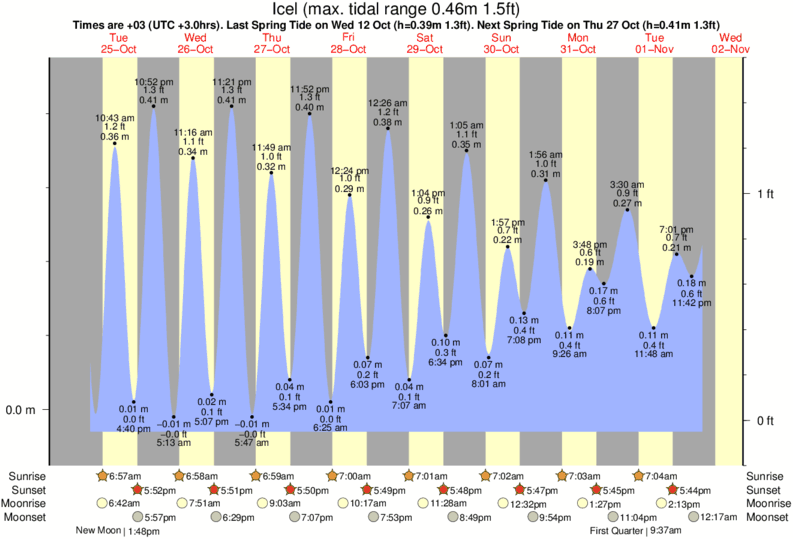 Tide Times are +03 (UTC +3.0hrs). Last Spring High Tide at Icel was on Sat 06 Dec (height: 0.42m 1.4ft). Next high Spring Tide at Icel will be on Sun 21 Dec (height: 0.38m 1.2ft).