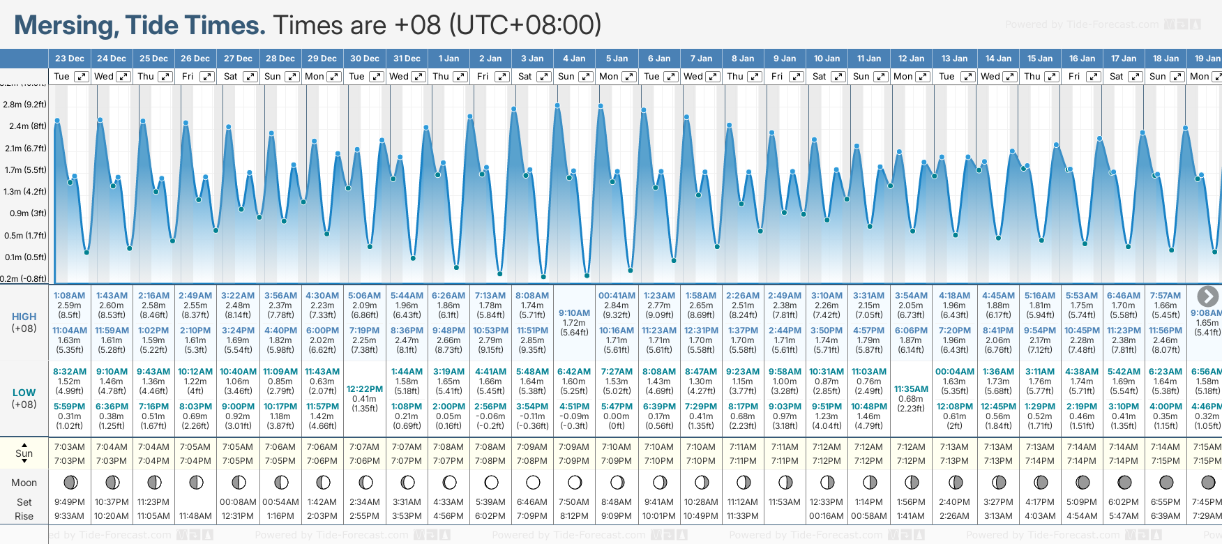 Tide chart for MersingShowing low and high tide times for the next 30 days at Mersing. Tide Times are +08 (UTC +8.0hrs).