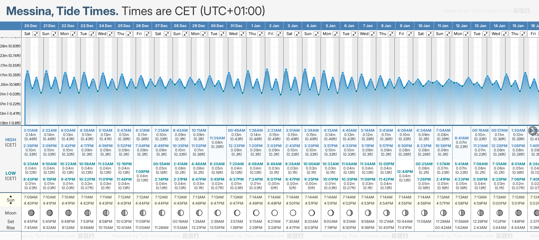 Tide Times are CET (UTC +1.0hrs). Last Spring High Tide at Messina was on Sat 06 Dec (height: 0.15m 0.5ft). Next high Spring Tide at Messina will be on Sat 20 Dec (height: 0.14m 0.5ft).