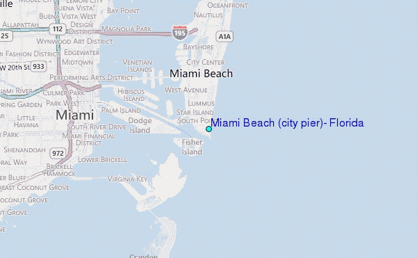 Use this relief map to navigate to tide stations, surf breaks and cities that are in the area of Miami Beach (city pier), Florida.
