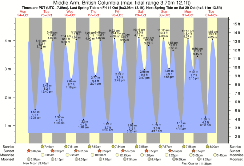 Tide Times are PST (UTC -8.0hrs). Last Spring High Tide at Middle Arm was on Sun 07 Dec (height: 4.53m 14.9ft). Next high Spring Tide at Middle Arm will be on Sat 20 Dec (height: 4.14m 13.6ft).