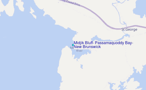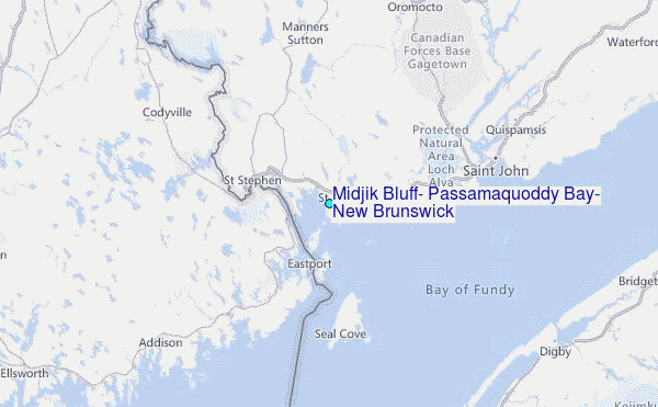Use this relief map to navigate to tide stations, surf breaks and cities that are in the area of Midjik Bluff, Passamaquoddy Bay, New Brunswick.