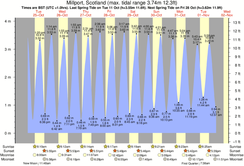 Tide Times are GMT (UTC +0hrs). Last Spring High Tide at Millport was on Mon 08 Dec (height: 3.74m 12.3ft). Next high Spring Tide at Millport will be on Mon 22 Dec (height: 3.54m 11.6ft).