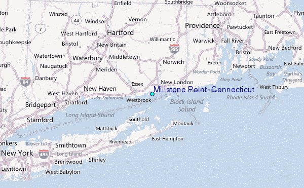 Use this relief map to navigate to tide stations, surf breaks and cities that are in the area of Millstone Point, Connecticut.