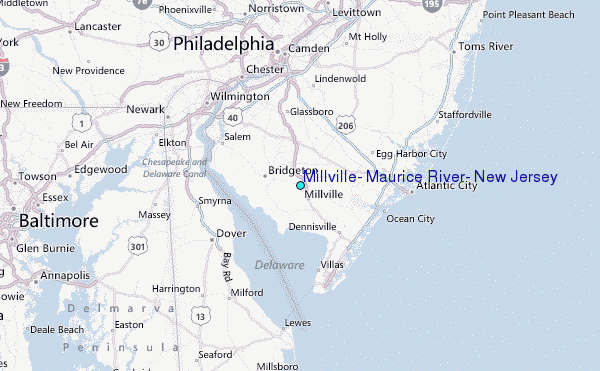 Use this relief map to navigate to tide stations, surf breaks and cities that are in the area of Millville, Maurice River, New Jersey.