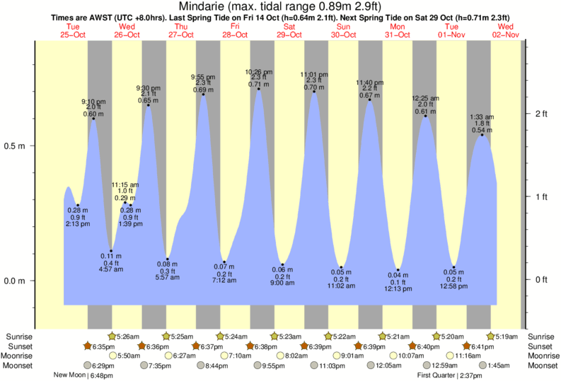 December and January Tide charts for Mindarie: The tide charts below show the height, time and date of high and low tides for the next 30 days.