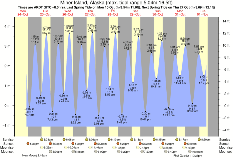 Tide Times are AKST (UTC -9.0hrs). Last Spring High Tide at Miner Island was on Fri 05 Dec (height: 4.04m 13.3ft). Next high Spring Tide at Miner Island will be on Sat 20 Dec (height: 3.44m 11.3ft).