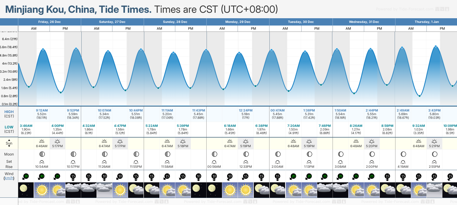 December and January Tide charts for Minjiang Kou: The tide charts below show the height, time and date of high and low tides for the next 30 days.